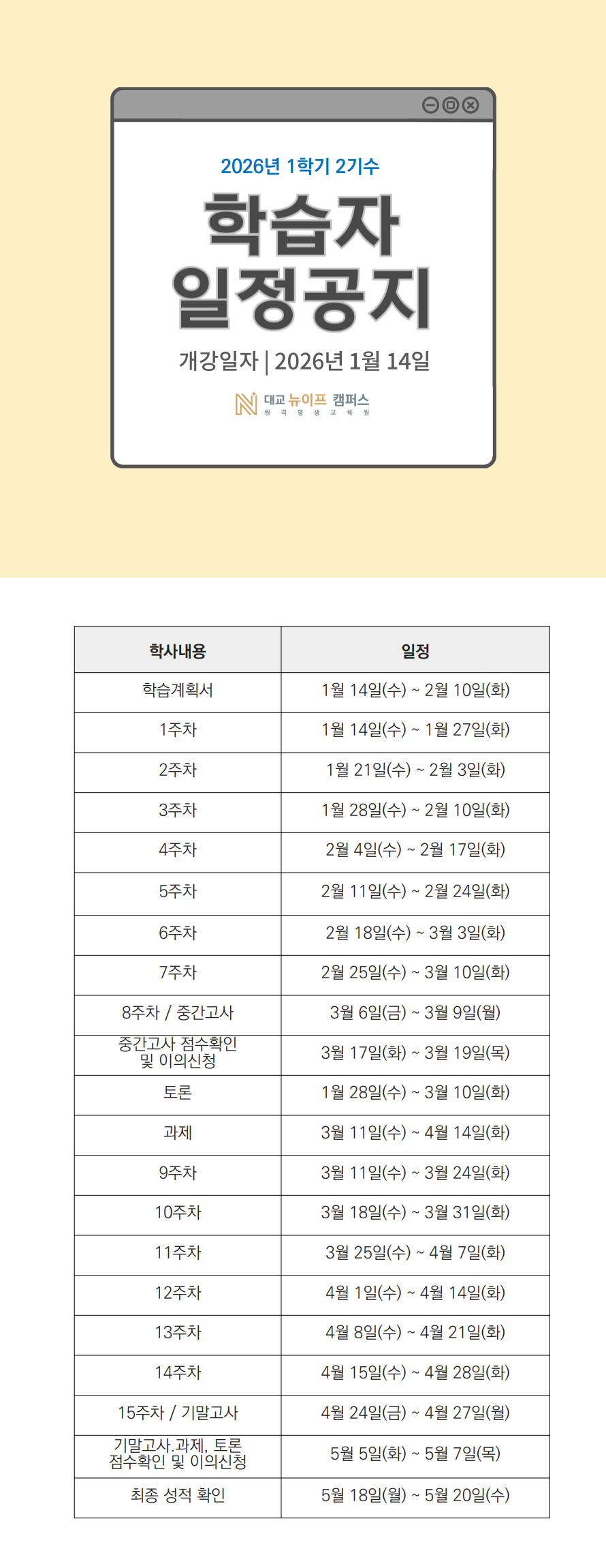 일정 : 2026.01.14 ~ 2026.04.28
